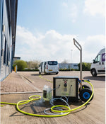 Aquí hemos reunido los componentes principales del sistema portátil Foamion, incluida la unidad principal, el carrito y algunos accesorios de manguera.